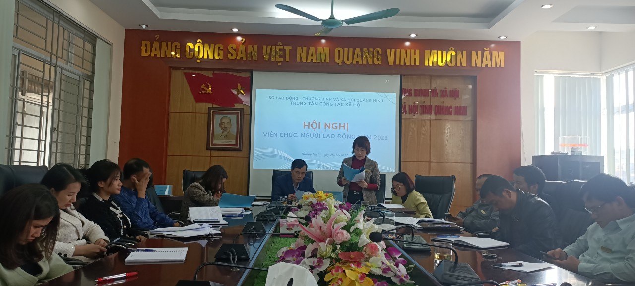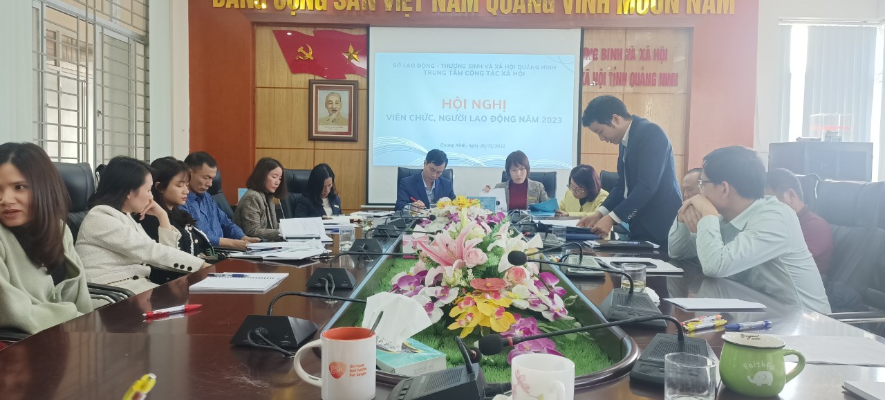 Thực hiện Công văn số 3902/LĐTBXH - VP ngày 01/12/2022 của Sở Lao động - Thương binh và Xã hội về việc tổ chức Hội nghị công chức, viên chức, lao động năm 2023. Ngày 26/12/2022, Trung tâm Công tác xã hội tỉnh Quảng Ninh tổ chức Hội nghị viên chức, người lao động năm 2023. Tham dự Hội nghị có tập thể Ban Giám đốc và toàn thể viên chức, người lao động của Trung tâm Công tác xã hội.
